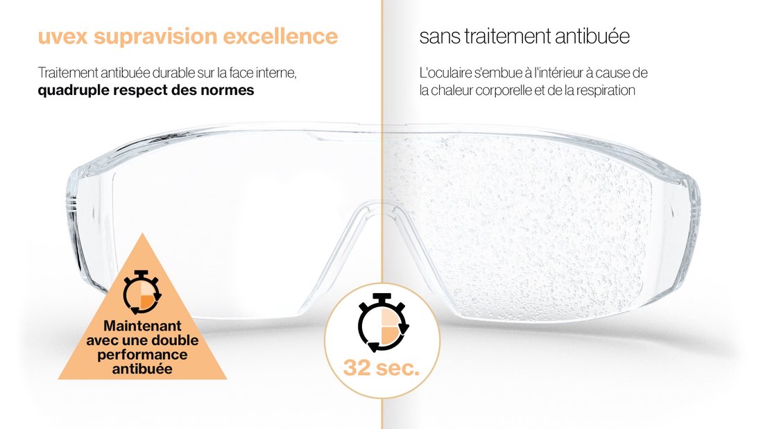 Toutes les lunettes de protection traitées uvex supravision excellence reçoivent automatiquement le traitement nouvelle génération depuis août 2021.